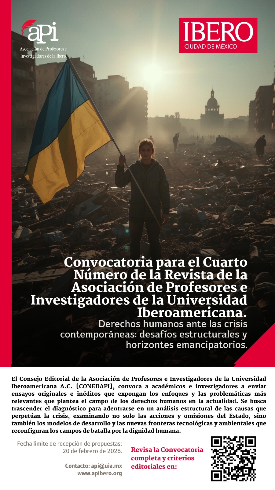 El Consejo Editorial de la Asociación de Profesores e Investigadores de la Universidad Iberoamericana A.C. [CONEDAPI] invita a académicos e investigadores a enviar ensayos originales e inéditos para el Cuarto Número de la Revista, con la temática "Derechos humanos ante las crisis contemporáneas: desafíos estructurales y horizontes emancipatorios".